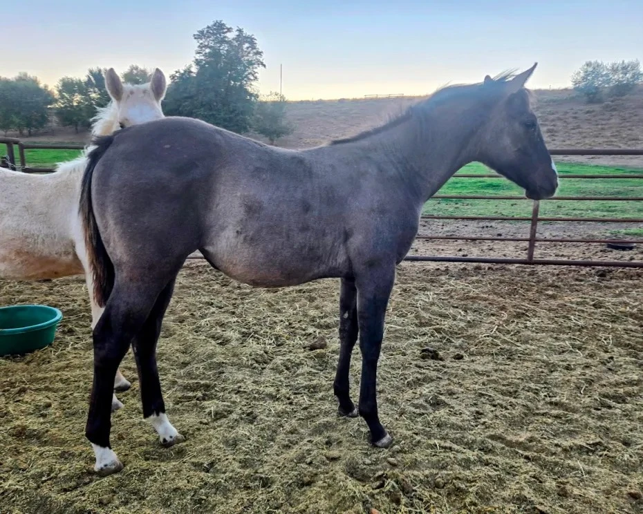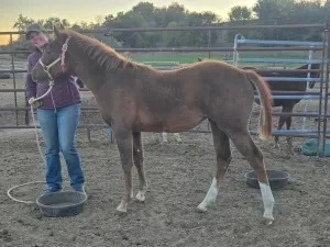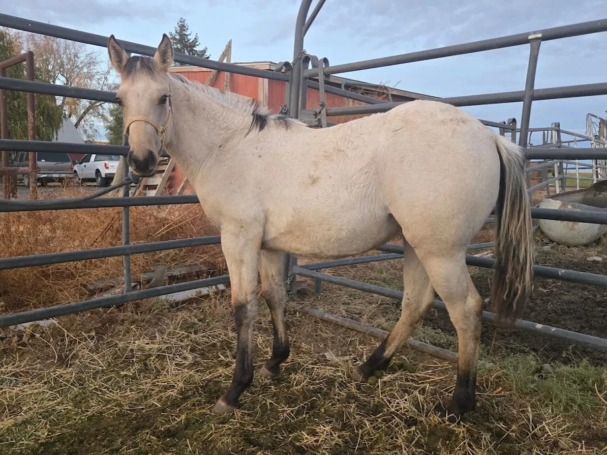Here is a fancy dun filly by KT Gunners Sage Bug and out of Shesa Leo Dandy, “Eddie.” KT Gunners Sage Bug is out of Continental Lady Bug and is by KT Gunpowder N Lead. Gunner is a roan dunskin son of Cue Bars Laddie, AQHA point earning and producing stallion. Gunner’s dam, Pistol, has been shown NFQHA, has been featured on rule book and in the NFQHA magazine. She is a great working ranch horse, rope horse, and the kids can ride her as well. Pistol’s sire, Gold Country Charro is a dunskin stallion that was shown in 1998 and 1999 in halter at local shows. Lady Bug is a big boned Continental Cad daughter going back to Mr Blackburn on the bottom. Eddie is a cute buckskin mare that came to us from Ed Hayes in St John. She is a very personable and balanced mare. On the top side she goes back to King Leo Bar and Quadrant. On the bottom she goes to Cuttter Bill, Doc Olena and Leo Gann. This filly has some pretty cool old school breeding.